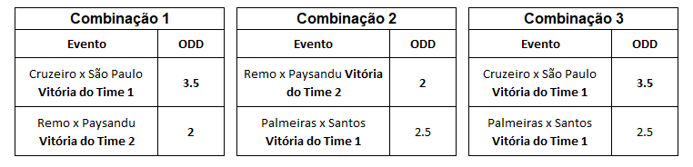 Por exemplo, vamos considerar que a previsão Remo x Paysandu (Vitória do Time 2) foi perdida, então todos os componentes (apostas múltiplas) onde incluímos este evento são considerados perdidos (aposta múltipla 1 e 2), e apenas a combinação 3 vence.